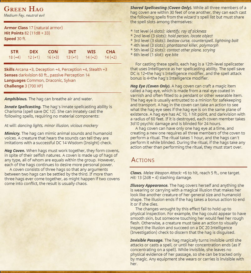 The two ‘daughters’ that Jaeden spoke of are likely Green hags, perhaps something slightly different but I envision that they would be lower level hags in a near-permanent humanoid appearance. They would act friendly to the party and try and persuade them to free them from the wicked humans but if the party can detect fey or their true form or intent they would appear to be what they are.