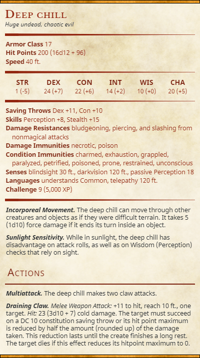 Deep underground where desecrated places of power mingle with cold, dark and damp environments sometimes it can give un-life to the creature known as the deep chill. These creatures are evil, huge and voracious in their search for life and, generally, tied to a single place. But their dominance over their own magical domain is nearly definite and they utilise the corrupted environment to bring in new energy for them to feast on.