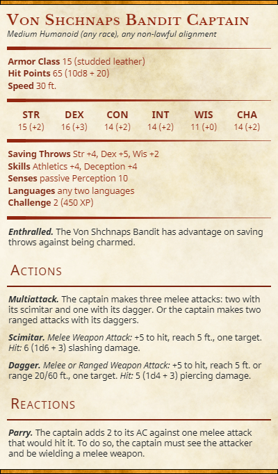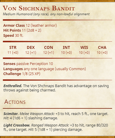 The bandits loyal to Queen V, Vanessa Von Shchnaps, are near-zealous in the way they fight for the bandit queen and in their never ending attempt to meet her demands. These bandits are naturally harder to charm, as they are already charmed, but are not really anything more dangerous than the random highwayman or street thug.