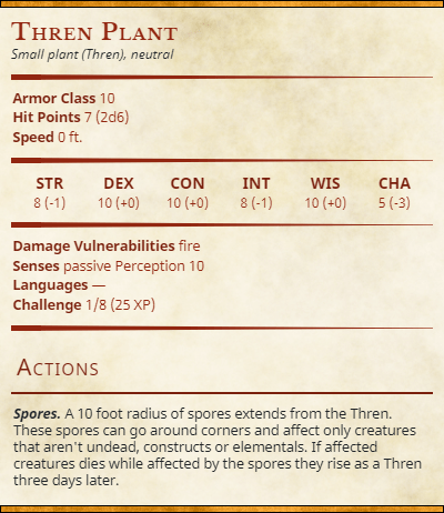 Small plants that look to be a mixture between a large leafed bulbous plant and a fungi grow in darker, low-light areas. Although not a fungi itself these plants emit spores that will grow on dead matter into the Thren itself – an organism that uses the nutrients in a creature to form a body for itself.