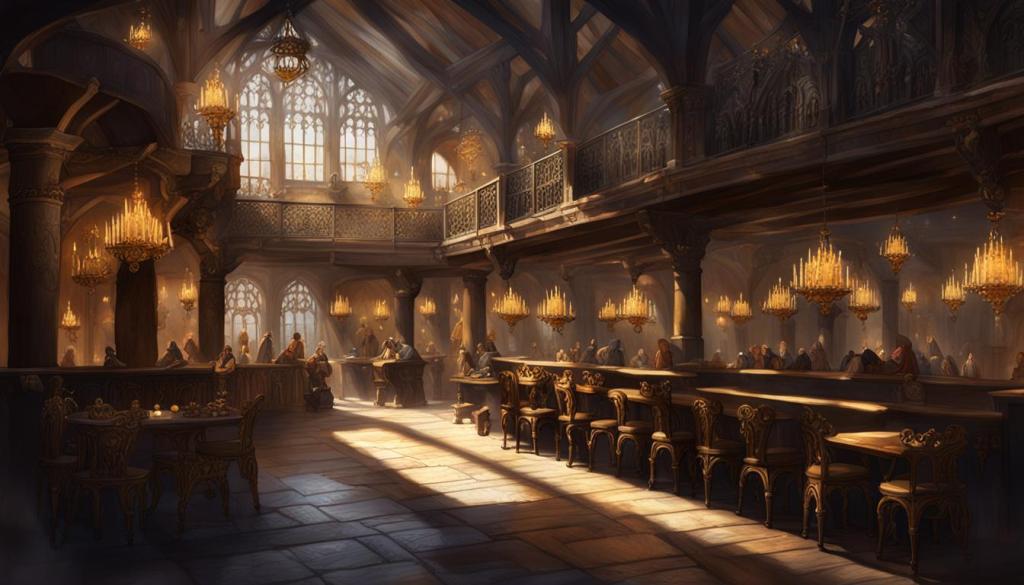 It is well lit with expensively crafted windows that sing of the guilds prosperity and renown. There mezzanine above the general hall has smaller more intimate chairs where people could discuss business with clients or each other if they wanted to have a more private word.