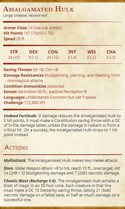 As the party struck down another husk zombie fell to the ground a vortex of magic appeared above where the inn would have been. A orb of magical energy formed as debris from the inn and the tower to Selune flew to form a shell around it. Within heartbeats a form started to take shape as both fallen bodies and the still moving forms of the undead that had been brought to life from the magic also joined the debris.The swelled until it was a glowing chaotic red-purple within the centre of the undead construct which began to lumber forward. Each step sent shockwaves out towards those standing against it and caused tiles from nearby roofs to fall down upon those still foolish enough to be standing on the streets.