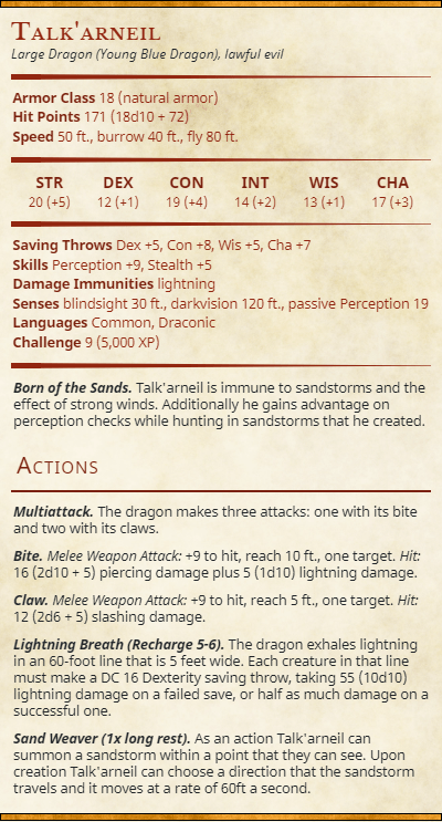 Thanks for joining me tonight as we look at variant blue dragon tonight. Talk’arneil is a strong and smart creature and despite being CR9, when fighting in these lands he will be a much stronger contestant. Don’t forget that more content is on the way tomorrow and also don’t forget to keep an eye out for the Zine when it comes out this weekend. And, as always, don’t forget to roll with advantage,