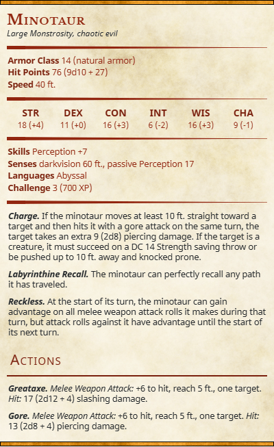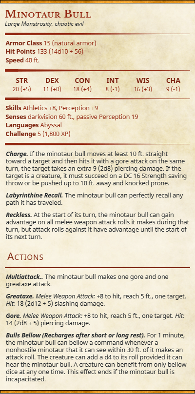 The basic minotaur is lethal in its own right. Able to throw caution to the wind and grant itself advantage on all attacks, raising its potential to hit by another 25%, roughly, but granting the same bonus for opponents to hit itself. But on the charge its able to deal immense damage that would fell a lesser man and heavily injure many these creatures are something to be feared.