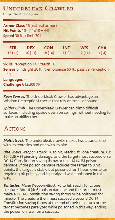 This week the party is attacked by one or more creatures that dwell under The Bleak, these creatures are unique to this cavern system and have been dubbed the Underbleak Crawlers. But before I get too excited on these creatures let’s kick into it.