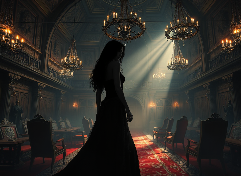 Emerging from the storage room, the party is confronted by a dimly lit hall, its opulence palpable despite the lingering scent of blood. Muted chandeliers cast dancing shadows on the intricate wood panelling and ornate carvings, which tell tales of the castle’s royalty. The luxurious red carpet underfoot, remembered from their earlier stumble, offers a stark contrast to their recent peril. Cushioned chairs line the walls, inviting rest, though the sense of looming danger prevails.