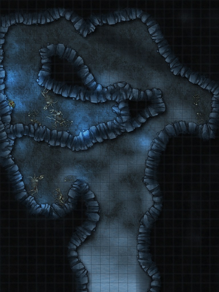 The ice on the ground and pools of frozen water, or blood, create several trip hazards for tonight’s encounter. There are bones that could be used as distractions or, weapons if used in the right moment but otherwise could prove to be detrimental for those trying to sneak through the cave system.