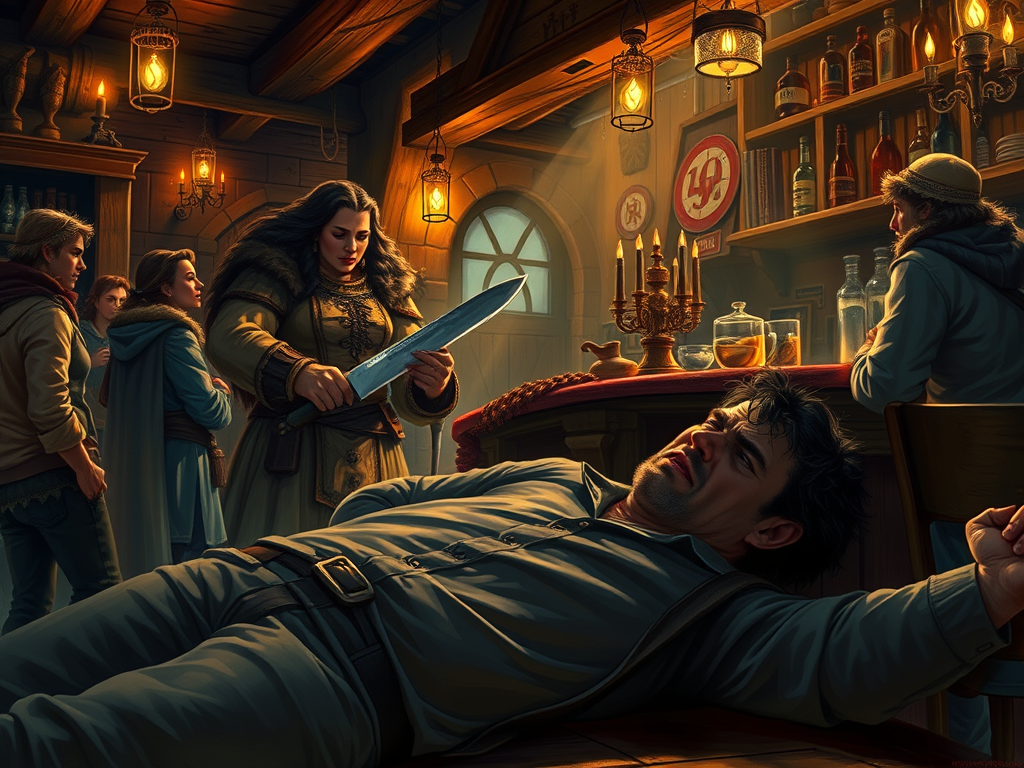 Suddenly, the atmosphere shifted as a faint cry for help reached their ears. The room fell silent, and the adventurers turned their attention to the door. A man burst in, his tunic torn and covered in mud and vomit, with claw marks raking his back. He collapsed, pleading for help. The party rushed outside to investigate, finding only barrels rolling down the road and indistinct footprints. Returning to the now-empty tavern, they discovered Goya nursing a broken lip and the man bleeding from new cuts. He warned them of a demon that grew angry when his shirt was removed, but despite their best efforts, the party found no evidence of a lurking demon.