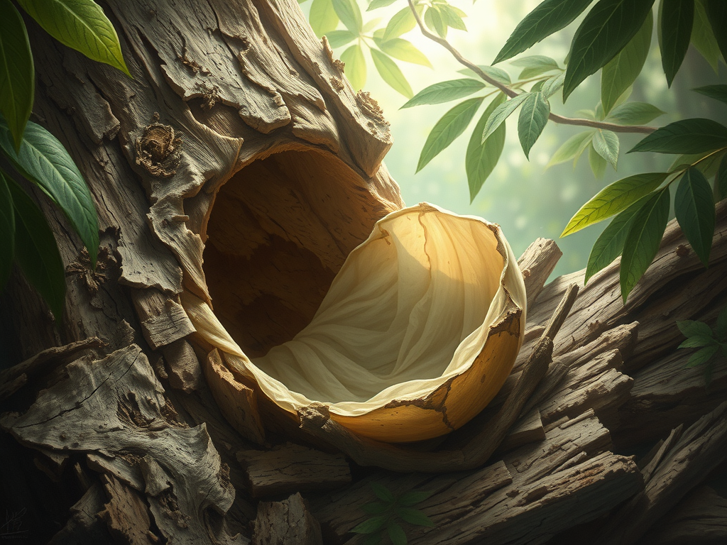 A large mixture of bark, hardened sap and splintered wood revealed an empty silken cocoon. Cut through with sharp blades or claws with evidence that something had dug its way in, or out. There was evidence that there once was other cocoons in this tree however a hollow in the tree was all that remained. Looking around for the source the party with Naya and her fellow scouts looked for the creature that had reportedly snatched at the cocoons.