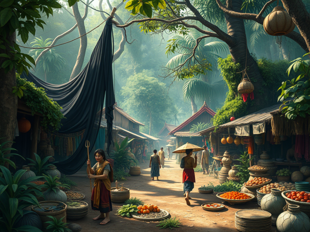 Ponkae was a hive of activity, with farmers harvesting silken cocoons from jungle trees in the tiered valley alive with buzzing insects and running water. Amidst this bustling scene, an untouched patch of trees hung with black cloth provided an eerie contrast. The party marvelled at the colourful marketplace filled with silken wares, fragrant oils, strong beers, and tantalizing food, showcasing the rich traditions and craftsmanship that defined Ponkae.