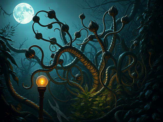 Night times are the worst time to meet a carnivorous creeper on a evening garden walk. These man-eating plants use paralytic pollen to prevent prey from escaping its questing vines, and the more it eats the more plants it can create in a short amount of time.