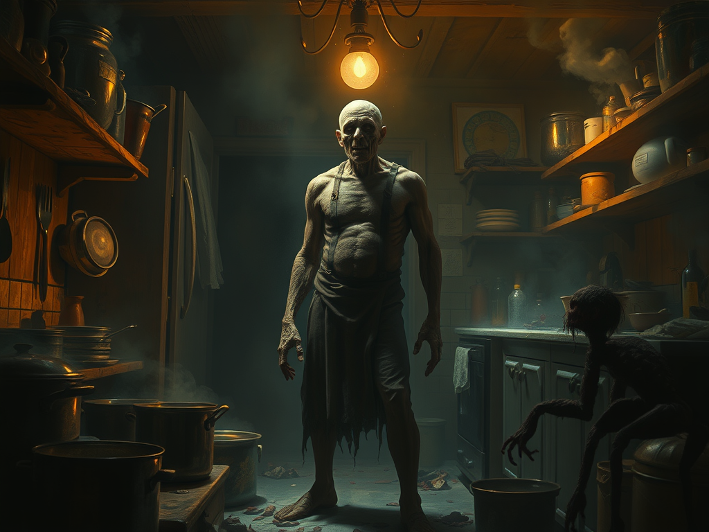 ‘The poor lad isn’t well and can’t stay on his feet for too long. But he’s getting there. I let him stay here where its warm and safe and he works hard.’ she added. Behind him in the pantry something moved, a thud on the stairs and the sound of something skittering in the dark beyond.