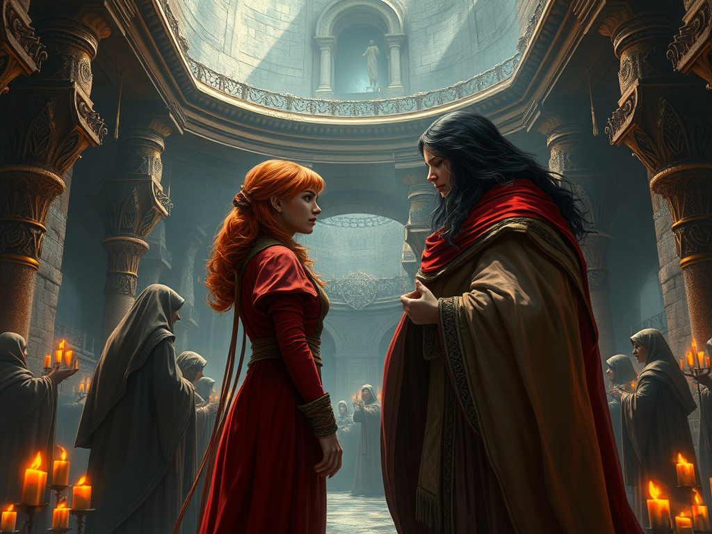 As the night descended into chaos, city guards intervened, but it was the Portent Quartet who truly calmed the frightened crowds. With the divination failing, uncertainty gripped the city, yet the party found shelter at an inn, securing a good price in the confusion. The next morning, they encountered a mysterious woman in a red cloak, Tusicka Ignate, the Diviner of Fire. She had seen their faces, clothing, and surroundings in her vision with eerie accuracy—something only true prophecy could reveal. Suspecting their importance in unravelling the city’s crisis, she bought them a meal and explained that someone inside the temple was interfering with the Oracle’s magic, corrupting divinations and throwing the city into disorder.