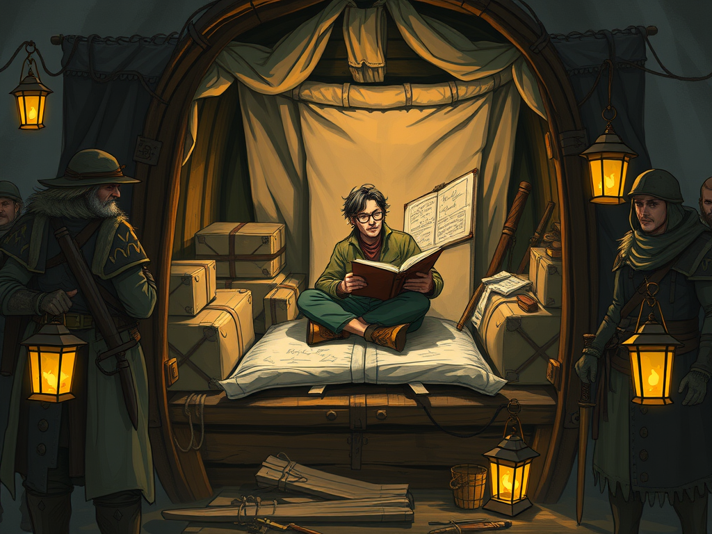 The party deftly unlatched the wagon door and swung it open as the other members of the party convinced the wagon driver to stand aside. Inside, among the carefully wrapped crates of supposed artwork, sat Reginald Tibidius Archer, cross-legged atop a bundle of canvas, a quill in hand, scribbling furiously in a leather-bound journal.