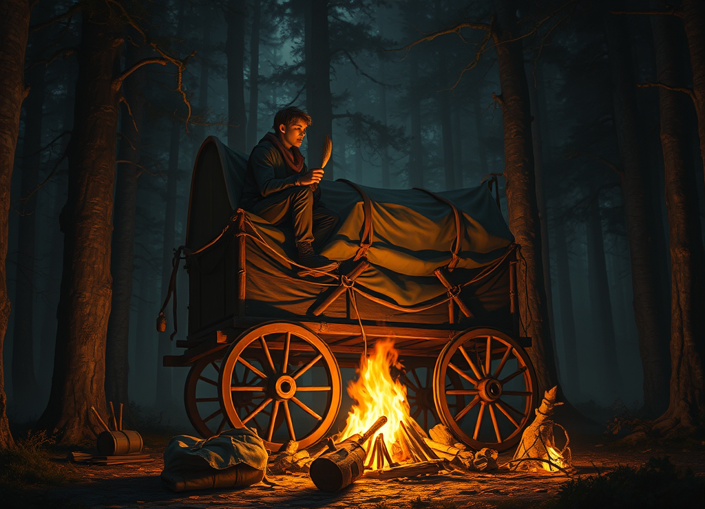 ‘I worried that the trail of food would not be enough. But I think this has done it. I saw something in the distance moving. Best wake up the rest of them as I believe I will finally have the inspiration I need for my masterpiece!’ he smiled broadly as he climbed to the top of his wagon and sat on the canvas with quill and parchment, waiting.