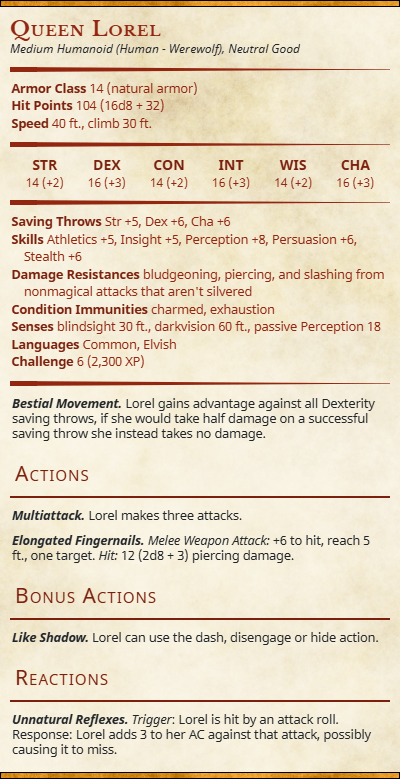Tonight we have a new kind of fight night for our party where they encounter Bestial Lorel. While not like an average encounter the idea here isn’t to kill Lorel but to try and work out what is causing her to be so aggressive and bestial.