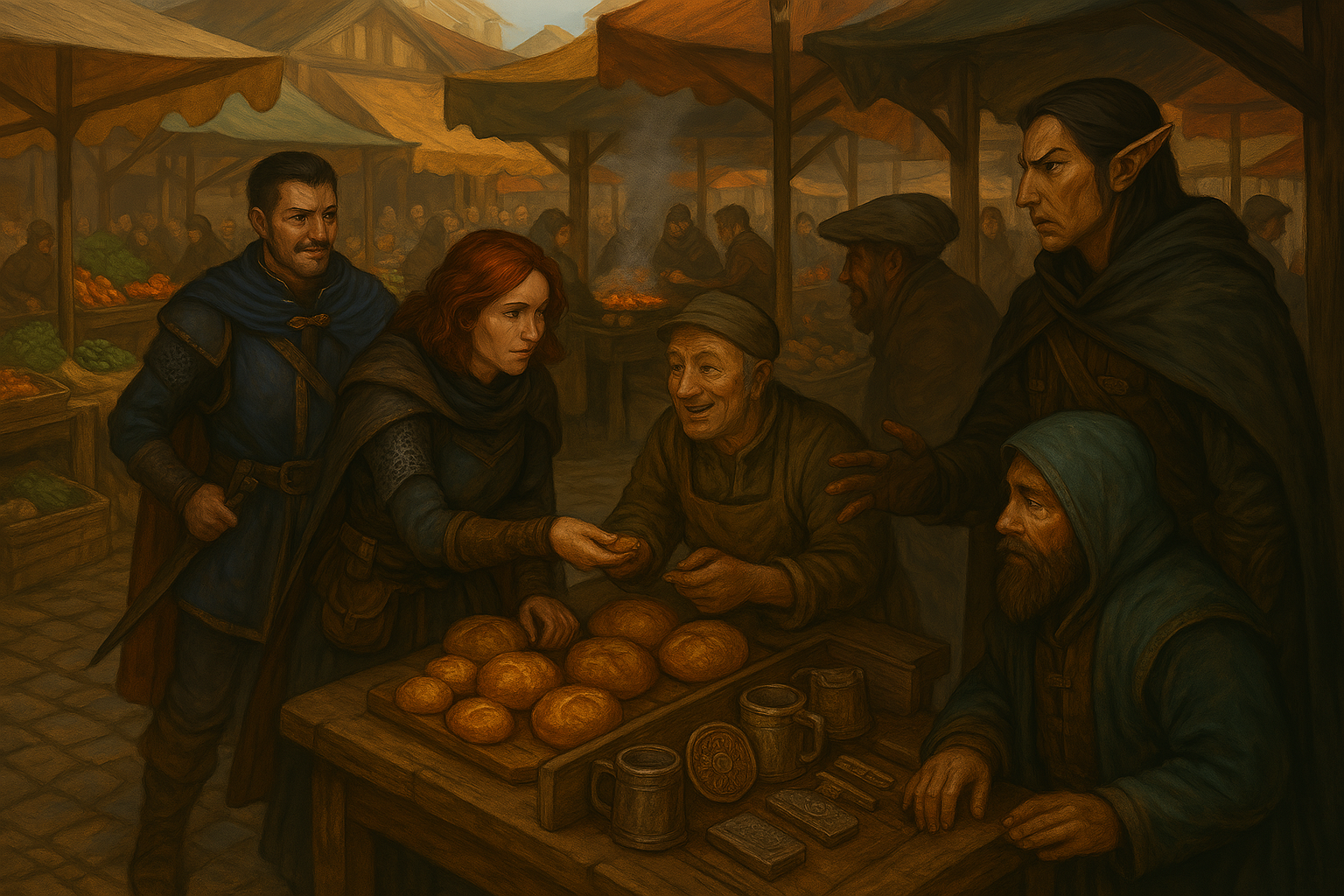 It didn’t take long for them to find another stall that sold something else of interest and soon they were getting the information they were after. There was a merchant at the market that was selling dwarven goods and despite the mercenary of the elf they asked attempting to intervene between the party and the baker who offered the information for a handful of gold.