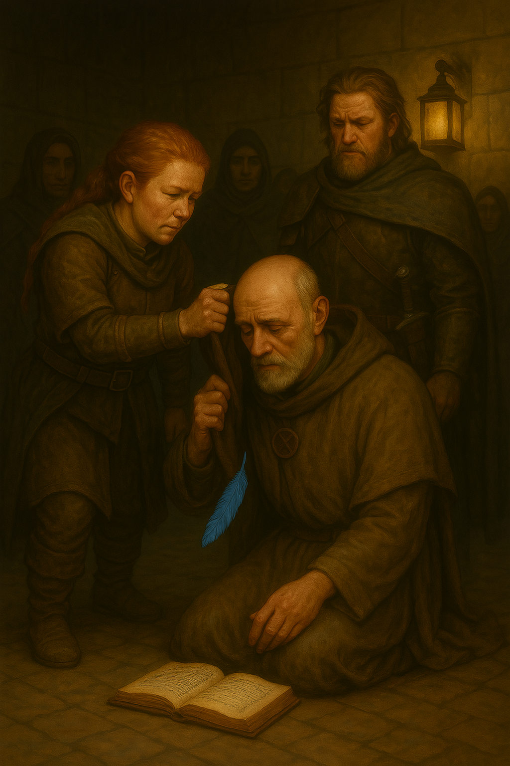 Elaric didn’t resist. He knelt, not out of submission but exhaustion. ‘I serve Imiriel,’ he began quietly. ‘She teaches remembrance. That all endings are sacred from the meek to the mighty. When the High Priests summoned me, they claimed her silence was a condemnation. That Carlo’s dual blessings mocked every god and that she was silent because of him. They told me his sacrifice would preserve balance.’