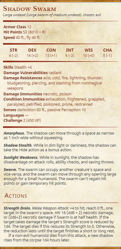 D&D Statblocks for Shadow Swarm and Shadow Beast – created in Tetra-cube.