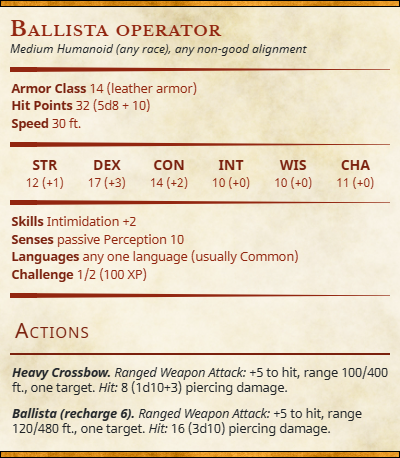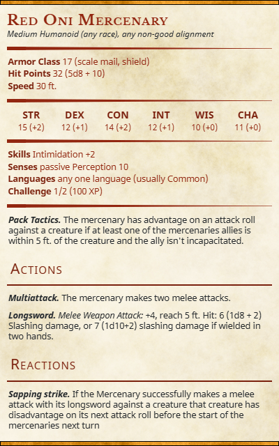 D&D Statblocks for Red Oni Mercenary, Blue Oni Mercenary and Ballista Operator – created in Tetra-cube.