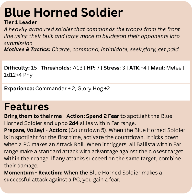 Trying something new tonight as I have spent a fair bit of time the last few days watching and reading up on the Daggerheart system. The horned soldiers fill out a bit of the roster tonight and learning how to balance a daggerheart encounter isn’t as had as I thought it would be. Several Red horned soldiers, a single blue one and at least four ballistae operators makes for a challenging but rewarding encounter.