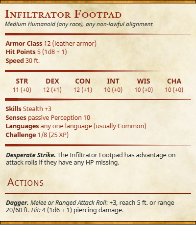 Where possible multiple Footpads will try and work together to restrain a party member by grappling and tying them up so that the Runner will gain advantage and finish them off. Otherwise its a pretty straight forward adventure with a single Runner or Shadow and a few Footpads to distract the party (scale with level of party)