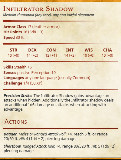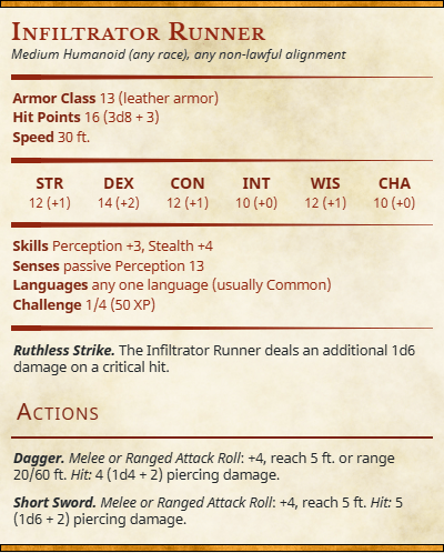 D&D Statblocks for Infiltrator Footpad, Infiltrator Runner and Infiltrator Shadow – created in Tetra-cube.