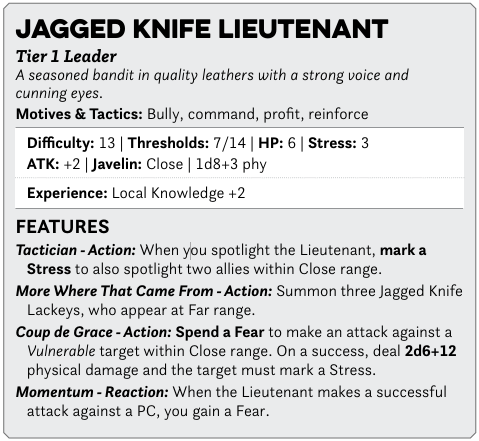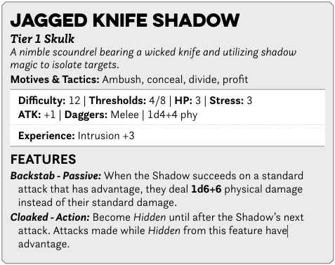 Trying something new tonight as I have spent a fair bit of time the last few days watching and reading up on the Daggerheart system. The Jagged knife Lieutenant will have a few Lacky’s with him in the warehouse where he uses them as cheap bodies to go and do what needs to be done. When the Lacky’s fall he will get more reinforcements that are returning back to the warehouse until out of resources, or, the Lieutenant fall. The Shadow and be positioned on a roof, in an alley or somewhere they can sneak up to ambush a party member before attempting to slip away to get the drop on their targets once again.