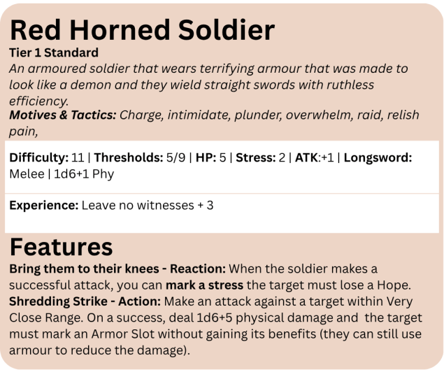 The above Adversary Stat block was created by me. Rules were adapted and inspired by adversaries and environments from theย Daggerheart System Reference Document 1.0ย and any likeness is the copyright of DRP, Darrington Press, who are the creators of the material (Adversary Stat Blocks). This content was modified/created is licensed under the DRP Community Gaming License which can be found here:ย Darrington Press CGL.