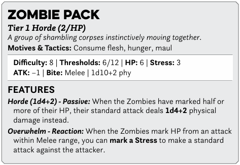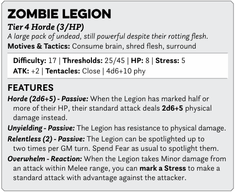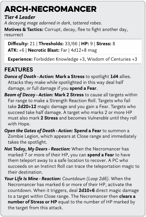 Based on the balancing section of the Daggerheart books we can have four of the Zombie Packs, three Zombie Legions and one Arch-Necromancer calling the shots and really driving the combat forward. This is set up for a series of T4 party members but if its lower tiers then it can be adjusted to make it work by reducing the thresholds and difficulty on the zombie legion and arch-necromancer as well as adjusting the damage and attack bonuses to lower levels.