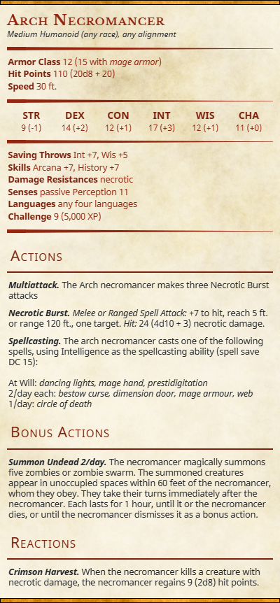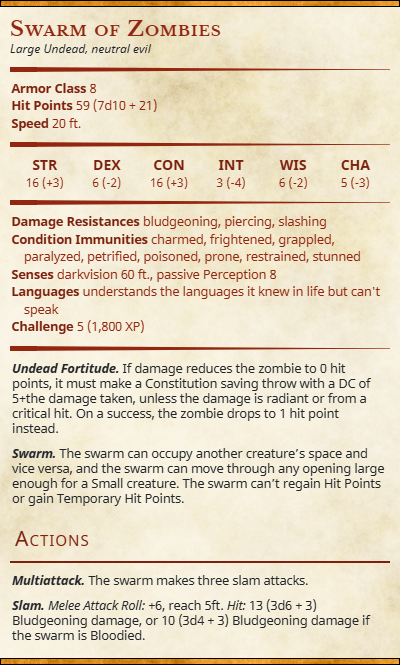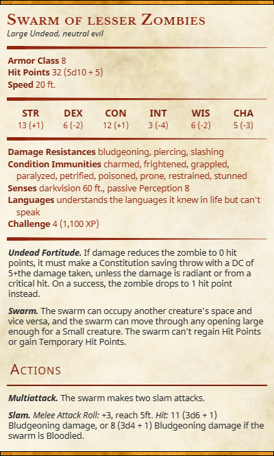 D&D Statblocks for Swarm of lesser zombies, swarm of zombies and Arch Necromancer – created in Tetra-cube.
