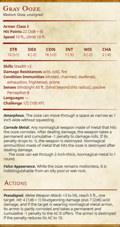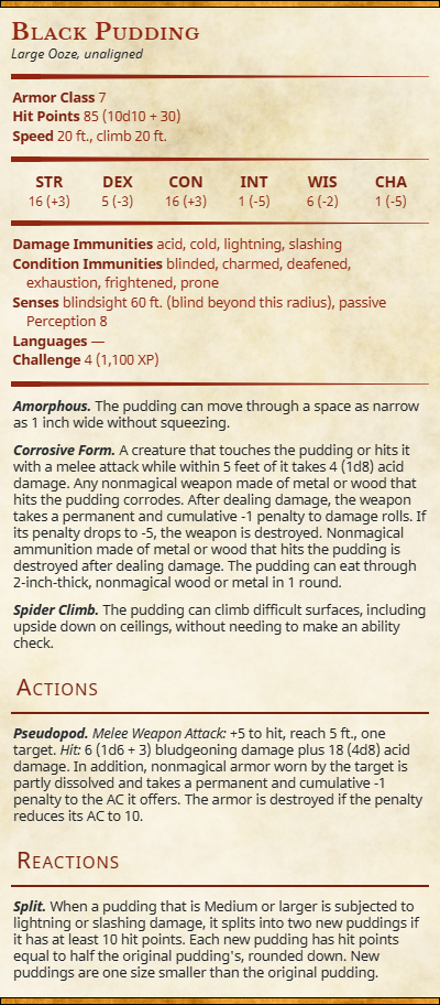 D&D Statblocks for Black Pudding, Gelatinous cube, Gray Ooze – created in Tetra-cube.