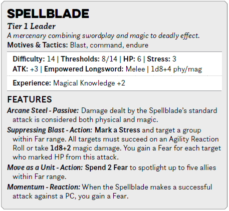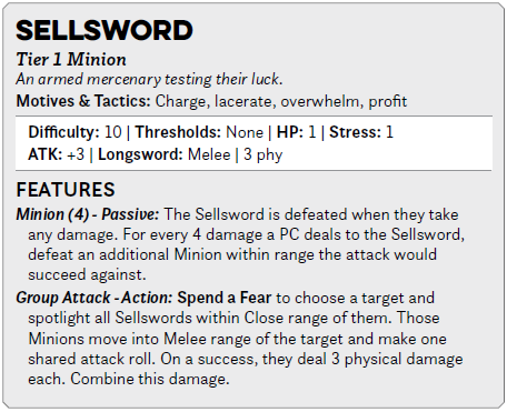 Based on the balancing section of the Daggerheart books we can have twelve sellsword’s as they have the minion tag and will die very easily, a single spell blade will command the lower level troops to cause distractions while the two merchants and two petty nobles, the target of this encounter, will try to remain protected as possible by getting their guards where they are. For the sake of this encounter I would change ‘Guards, seize them!’ to summon sellsword’s rather than bladed guards.