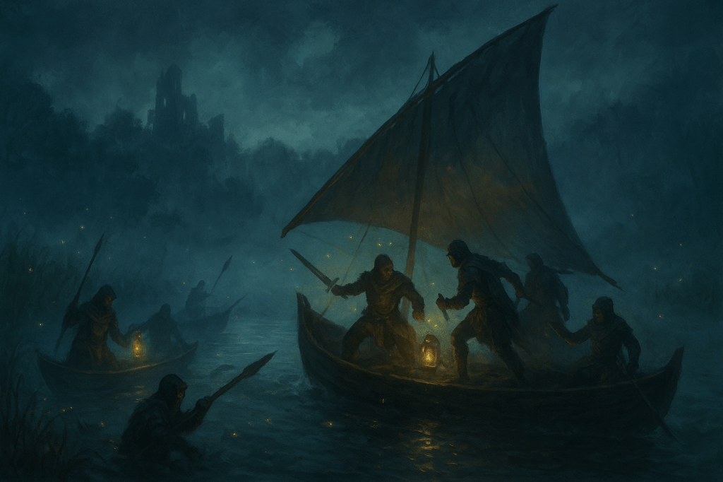 The adventurers escaped the raiders of the river only to find themselves stranded on a narrow, weed-choked shore. Behind them, their ship lay broken, half-submerged and silent save for the hum of fireflies circling the wreck. Before them stretched the Wraith Woods, a place whispered of in dread; a wall of twisted trees where few who enter are said to return. With little choice, they gathered what supplies they could and pressed onward, leaving the ruined vessel behind.
