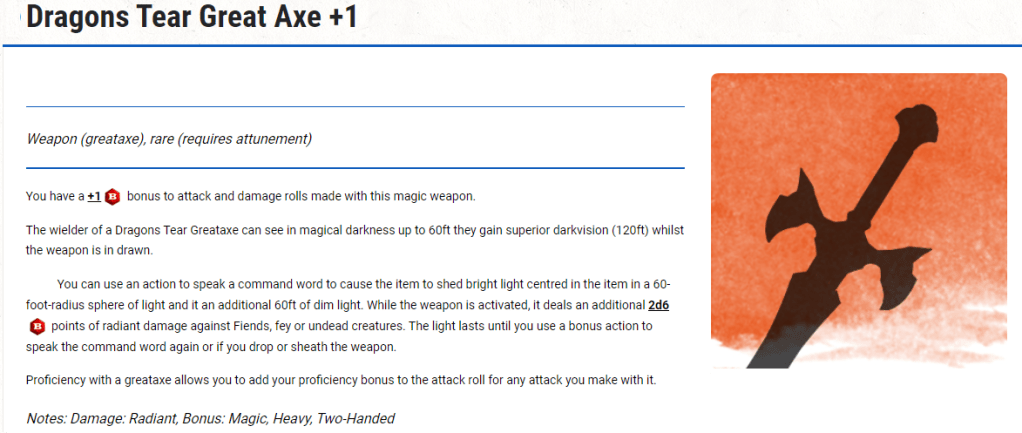 Raising his battle axe high he aimed to disembowel the foul creature so he could make a clear path for his wounded allies to travel past to the relative safety of the cliffs behind the orc that had ambushed them. Calling out a mighty battle cry he attacked (rolling advantage 3, 1d20+2d6(+3d6 advantage*): 24! with an exploding d6!) and connected meatily with the midsection of the orc (guard 13). As he connected he stepped forward and pushed with his trained strength and pushed the orc 10 feet backwards in addition to dealing 11 points of damage. “Go now! I’ll deal with this beast and join you!” he called as he waded with shaking legs forward. He was not sure how much longer he could face off against his foe considering the state he was in.
