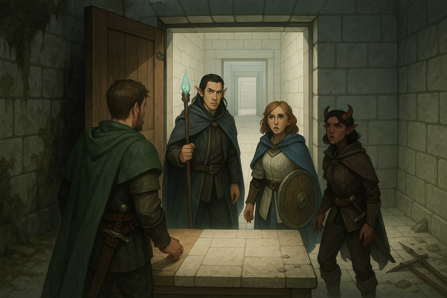 Inside the spire, the air carried the faint scent of parchment, candle wax and dust. The party were recognised quickly and were shown to a room on the seventh floor where Aleris Quall, clerk of the Eyeless Spire, was waiting for them and tapping her foot nervously. She was a slender half-elf with silver hair pulled neatly back, she wore deep blue robes that matched the ink stains on her fingers. Behind her desk, piles of scrolls and ledgers were stacked with impossible precision, yet a small tray of half-finished letters hinted at how quickly the day’s events had unsettled her.